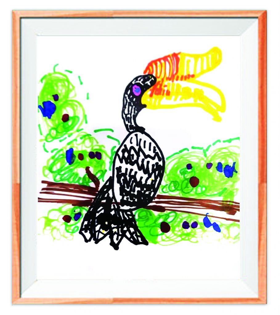 5岁的赵梓晴绘画了“森林的农夫”犀鸟。