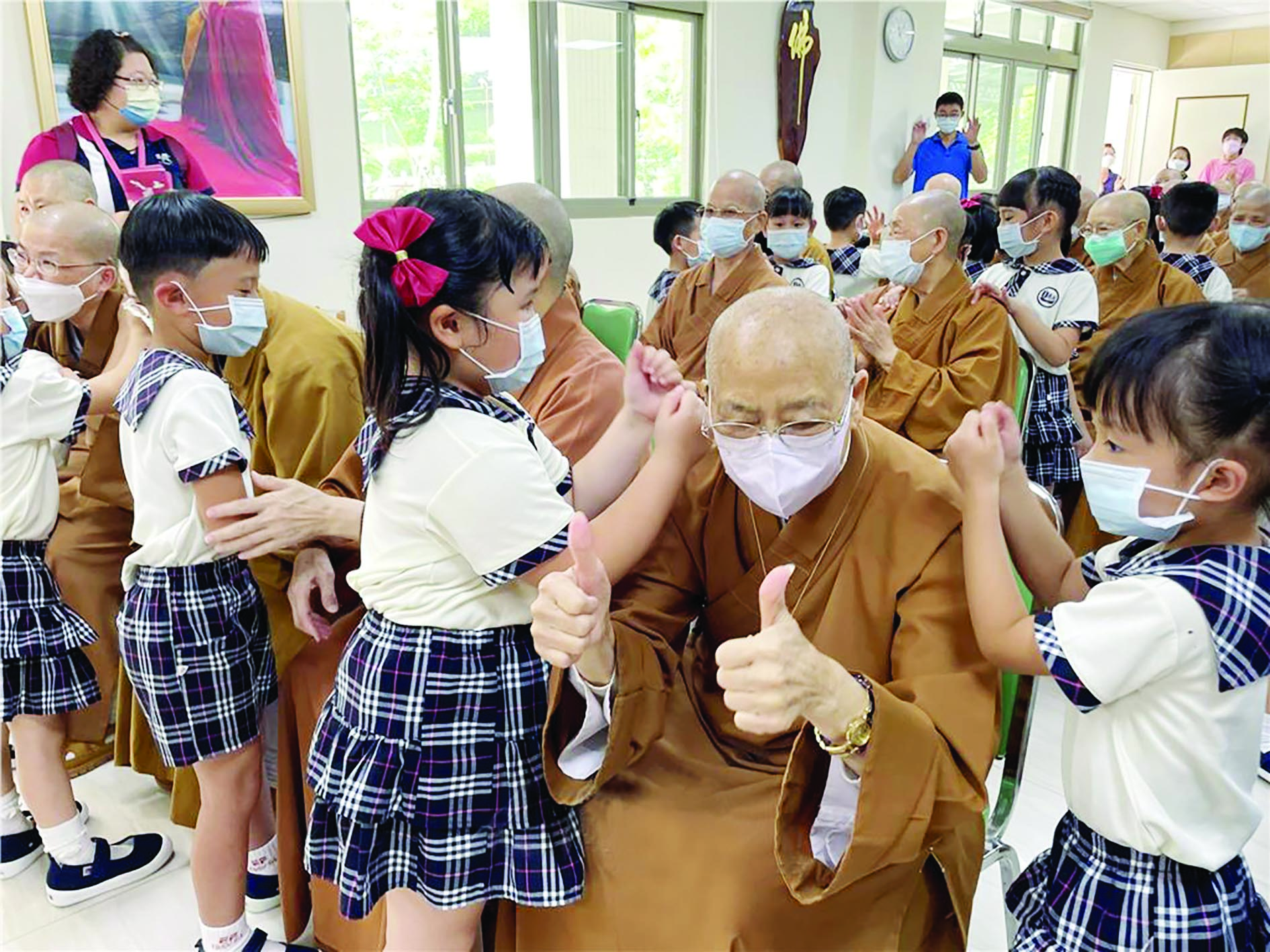 “人间最美是三好,做好事,说好话,存好心……”小菩萨随着音乐摆动,活泼可爱的表现,令人眼睛为之一亮,尤其《三好歌》让长者一同高声欢唱、热情舞动。配合律动间奏,小菩萨也为法师、阿公阿嬷们捶,并献上精心制作的感恩卡片及大大的拥抱,天真无邪的互动,令长者们笑不拢嘴。