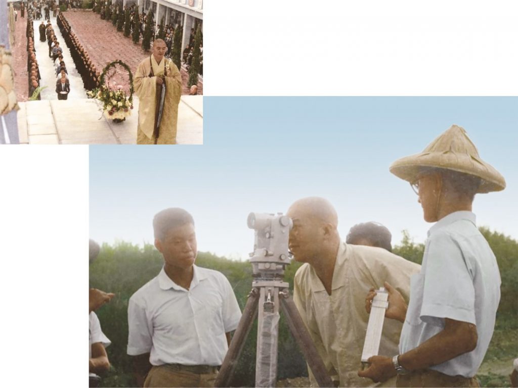 大图:1967年10月7至10日,省立高雄工业专科学校测量队为东方佛教学院测量等高线。(佛光山/图 徐宗懋图文馆数位彩色复原)