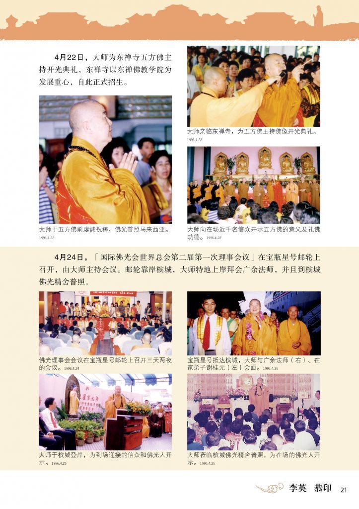 大师于4月10日槟城东姑礼堂演讲两天,题为「从禅师的修行说起」。与此同时,大师在会上宣布国际佛光会马来西亚协会的成立,并且把会旗交予首任会长邱宝光。