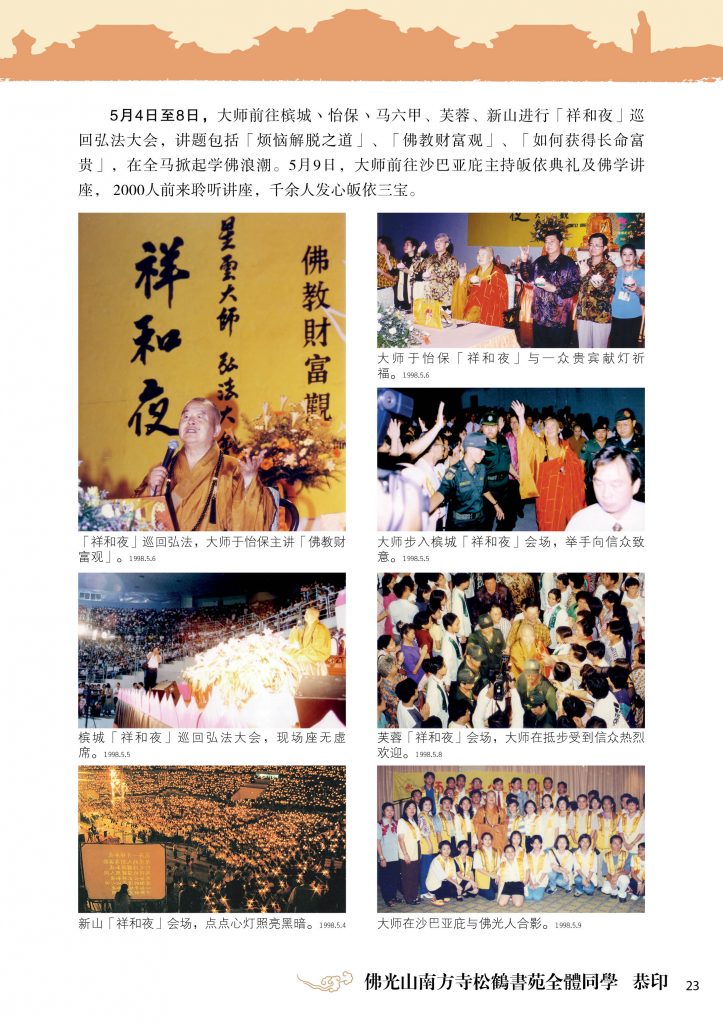 4月21日,马佛总与马佛光协会联办「万人皈依典礼及万人献灯祈福弘法大会」,在莎亚南露天体育馆进行。大师应邀主讲「人间佛教人情味」,吸引8万人潮前往参加盛会。活动圆满,大师在马佛总主席寂晃法师、时任交通部长林良实、内政部副部长黄家定的陪同下绕场一圈。