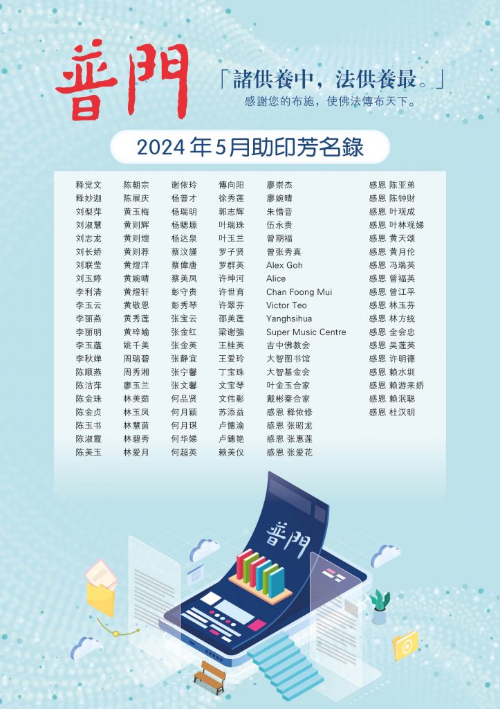 24 Apr 2024 普门【助印普门芳名】2024年5月份 by pumen editor | posted in: 助印普门芳名, 感谢助印, 生活资讯 | 0 出刊日期:01-05-2024 ** 如需引用或分享普门的内容,请注明出处,并附上原文的链接。 欢迎大家分享