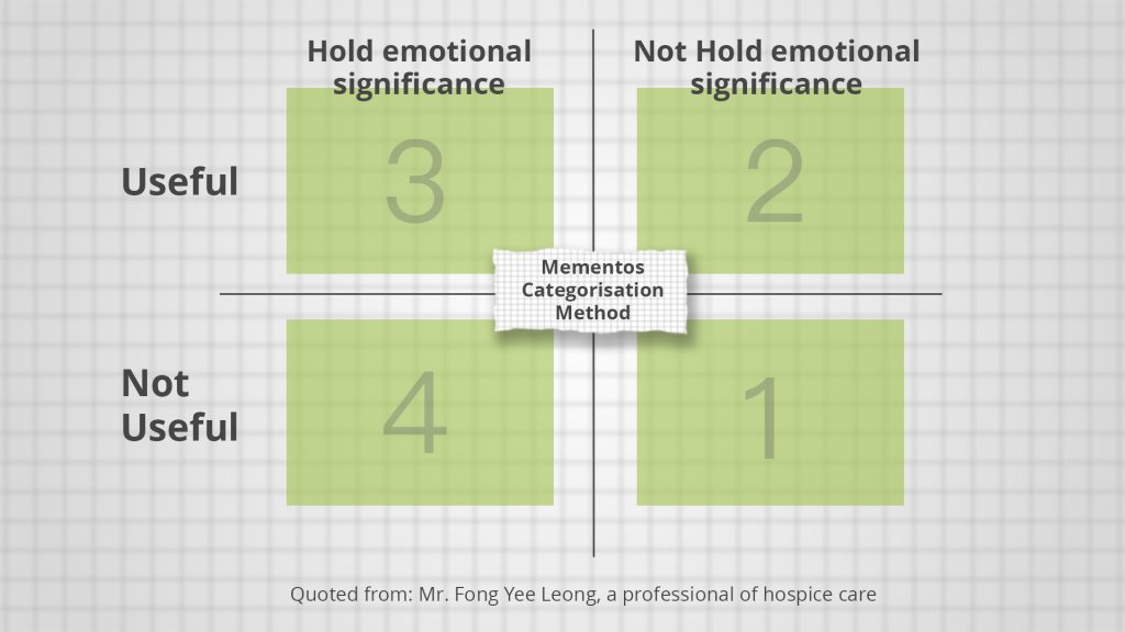 陈星如表示临终关怀推动者冯以量曾分享遗物分类整理的方法,秘诀就是分成「4个象限」,即是把遗物分成有用及无用两大类,接着以遗物的纪念价值,丧亲者是否会因该遗物想起逝者再分类。