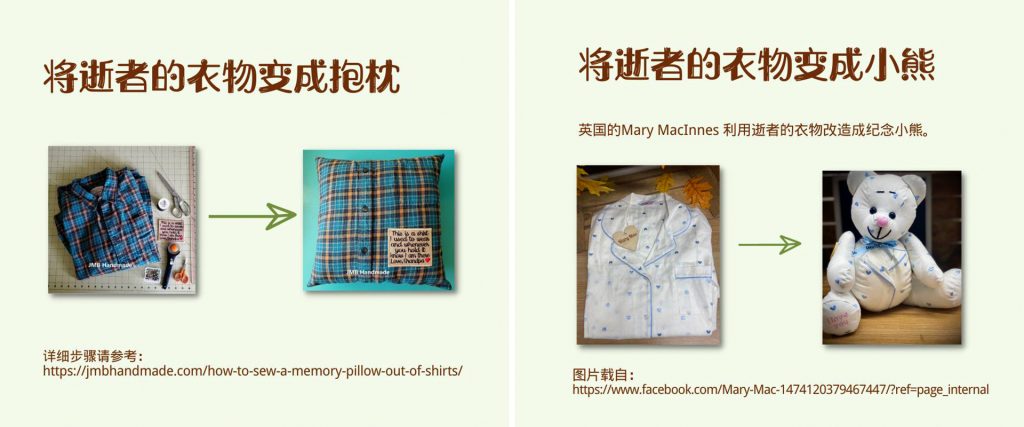 她表示,「丧亲者还可以将遗物收纳珍藏,同时可以用来再创作,为遗物赋予新的意义及生命。例如将至亲留下的衣物制作成手提包、枕头套、玩偶、毯子;杯子可以改装成小花盆等等。」只要用点巧思,就可以「化『遗物』为神奇」,创作成为一件实用又有纪念价值的物品了。