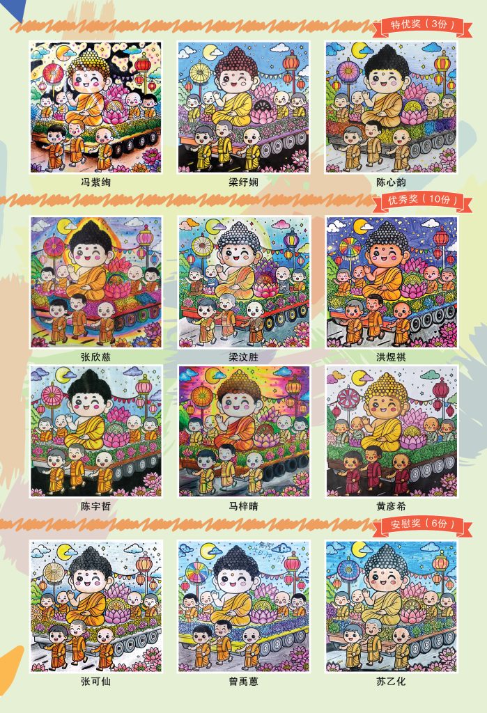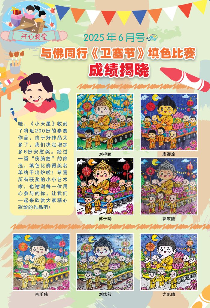 27 May 2025 小天星【开心奖堂】与佛同行《卫塞节》填色比赛 成绩揭晓 by pumen editor | posted in: 小天星, 开心奖堂 | 0 哇,《小天星》收到了将近200份的参赛作品,由于好作品太多了,我们决定增加多6份安慰奖。经过一番“伤脑筋”的筛选,填色比赛得奖名单终于出炉啦!恭喜所有获奖的小小艺术家,也谢谢每一位用心参与的你,让我们一起来欣赏大家精心彩绘的作品吧! 出刊日期:01-06-2025 欢迎大家分享