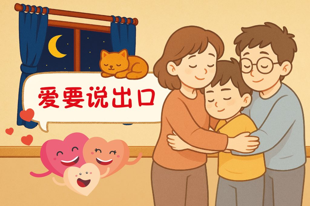 “好不好,我们3人有个约定:当只有我们的时候,就可以把爱说出来,然后拥抱彼此?”爸爸提出了建议。