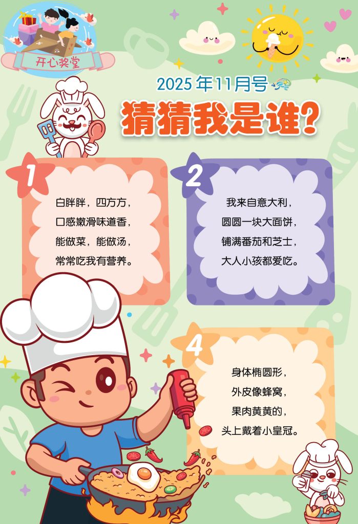 25 Oct 2025 小天星【开心奖堂】猜猜我是谁? by pumen editor | posted in: 小天星, 开心奖堂 | 0 小朋友们,这里有一些调皮的食物,它们藏着小秘密,等你来发现。 它们有的胖胖的、有的圆圆的、有的还有皇冠呢! 每一句谜语都是它在偷偷告诉你自己是谁,快跟着谜语去找答案吧! 出刊日期:01-11-2025 欢迎大家分享