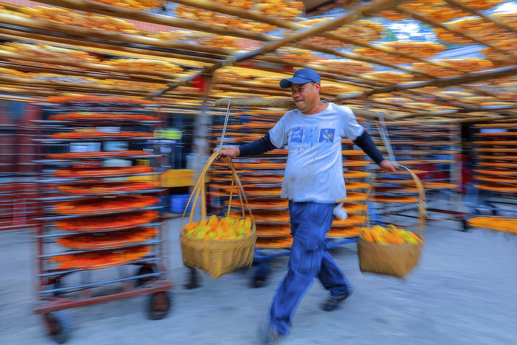 摄影所凝结的,不只是某一次工作的画面,而是一整个季节的缩影。农民的身影在画面中略显流动,那不是刻意的模糊,而是诚实地呈现劳动本身的节奏。晒柿饼从来不是静态的工作,它需要不断巡视、翻动、调整,随着风势与温度微调每一个细节。这样的节奏,一天又一天,在短暂的秋季反复上演。